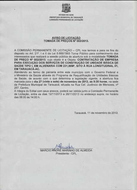 Atendendo ao termo de parceria entre este município com o Governo Federal e o Ministério da Saúde através do Programa de Requalificação de Unidades Básicas de Saúde, de acordo com o que determina a legislação vigente, a abertura fica marcada para o dia 27 (vinte e sete) de novembro de 2013, as 9:30 horas, na sede da Prefeitura Municipal de Tarauacá, situada na Rua Cel. Juvêncio de Menezes, nº 267, Centro.